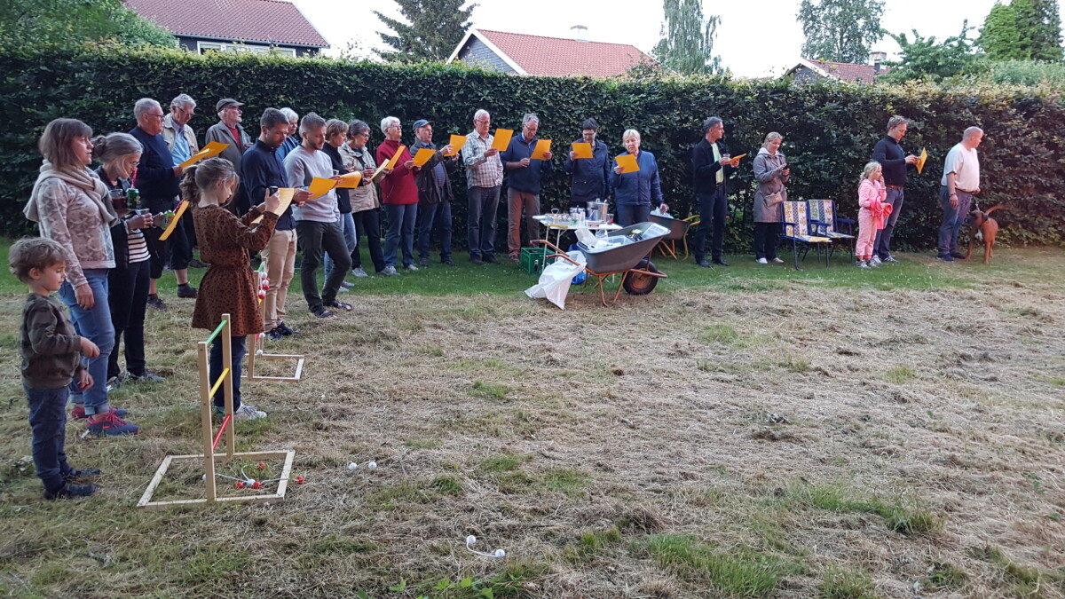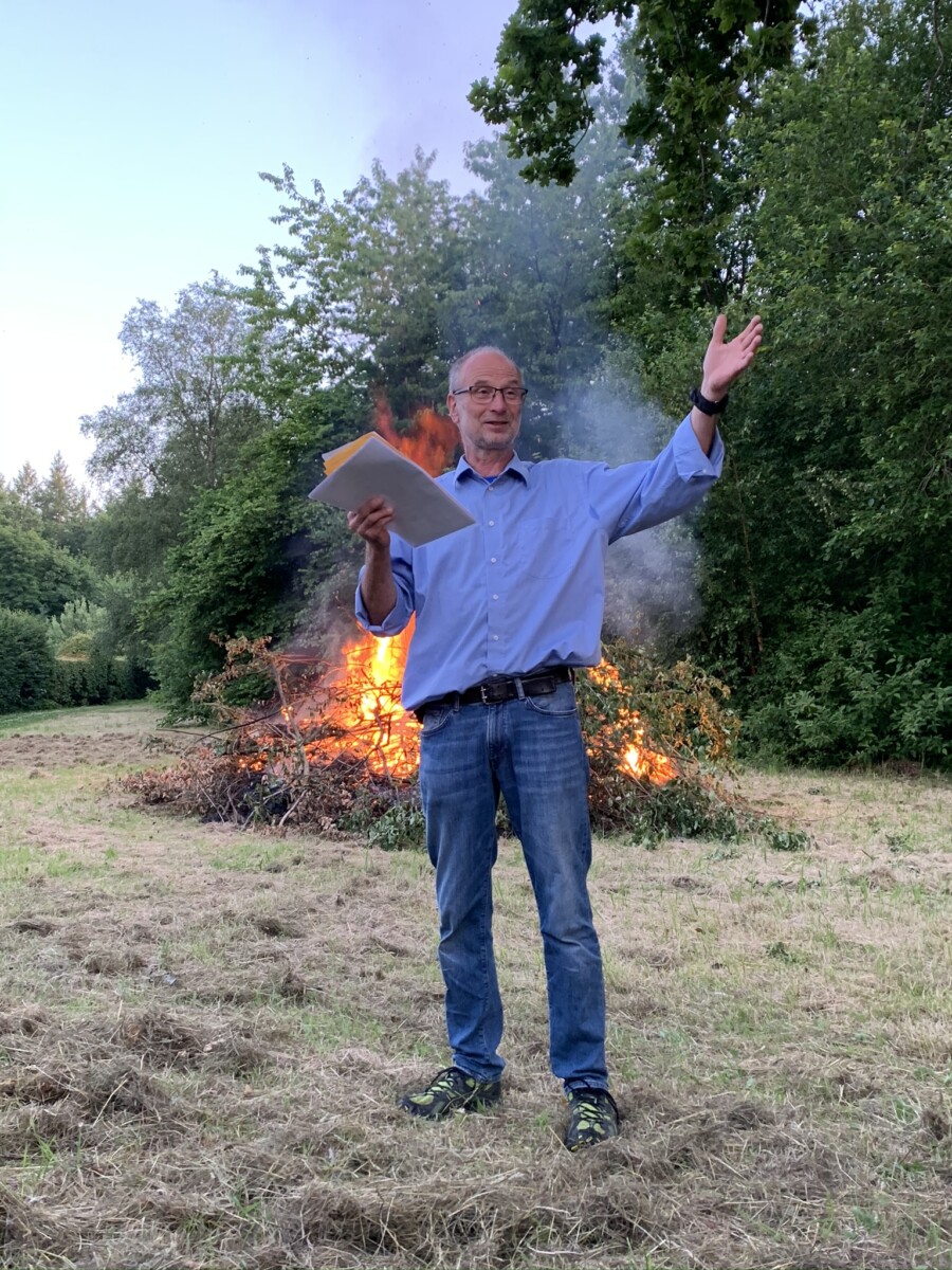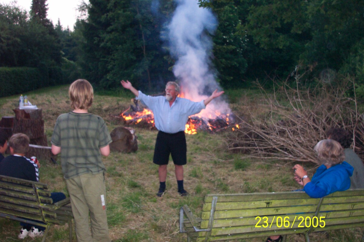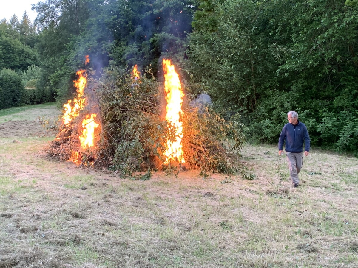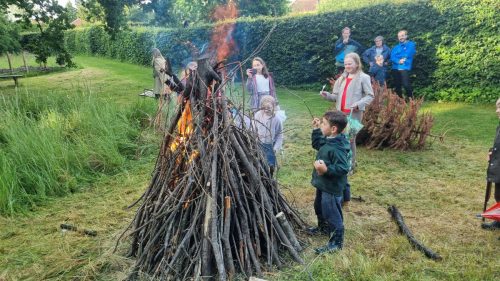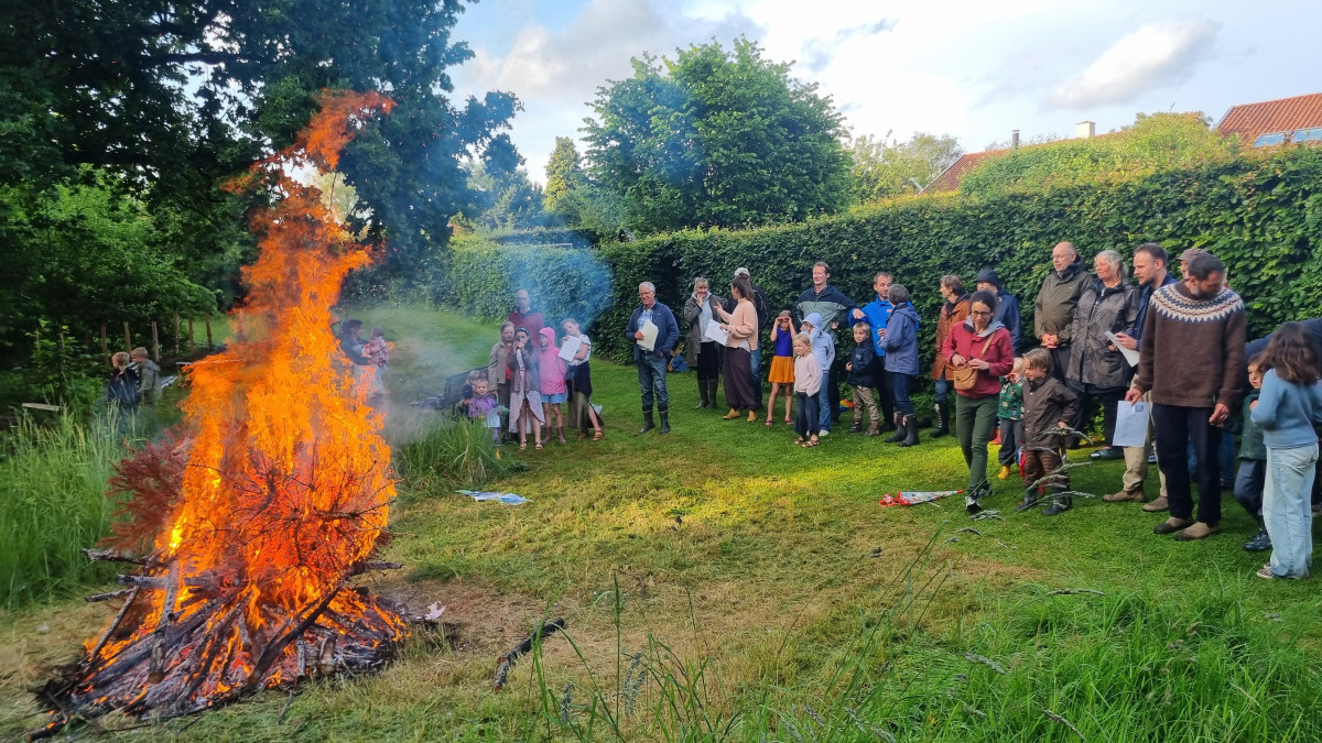 Igen i 2023 var der ikke bål. Alt var ellers tilrettelagt, bålet bygget op så vi let kunne få ild i det – med tørre grene fra forårets fældning af gråpilen ved søen. Men der var lige 1,5 måned uden regn og vi valgte i sidste øjeblik ikke at tænde bål, så der ikke føg gnister rundt i det tørre græs. Vi samledes så ved et myggelys og snakkede sammen i lang tid. Den sidste Skt. Hans med Peter og Berit som beboere her.