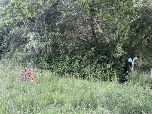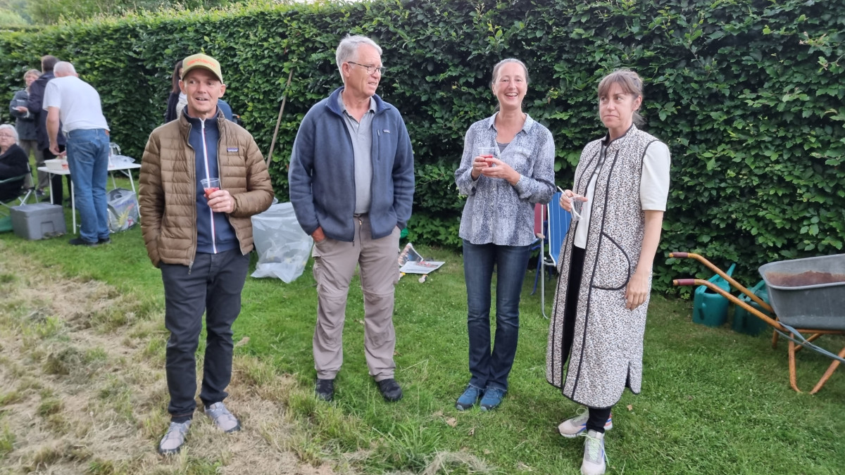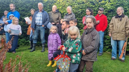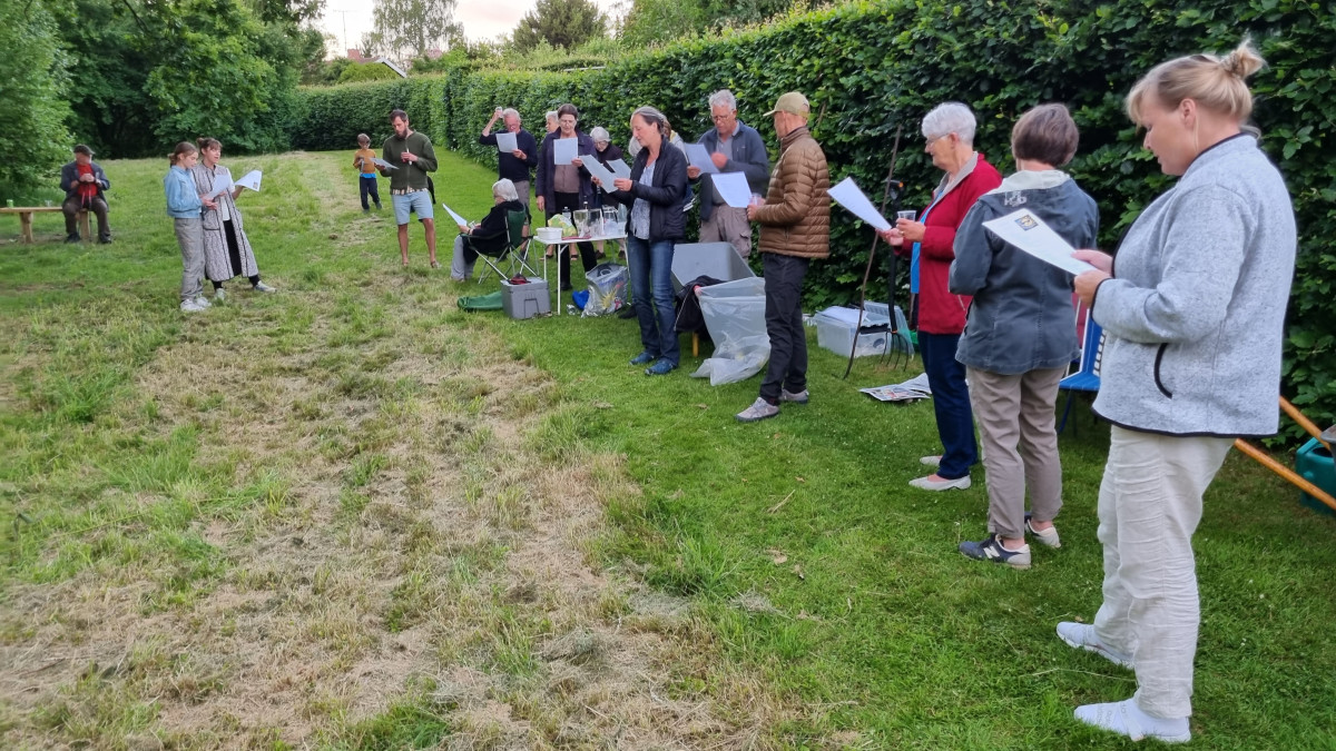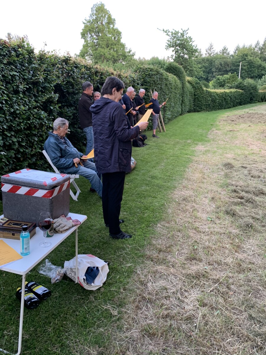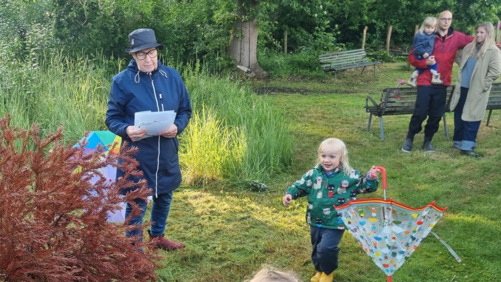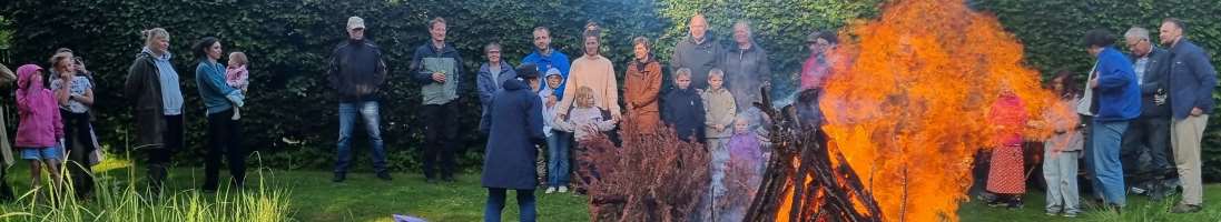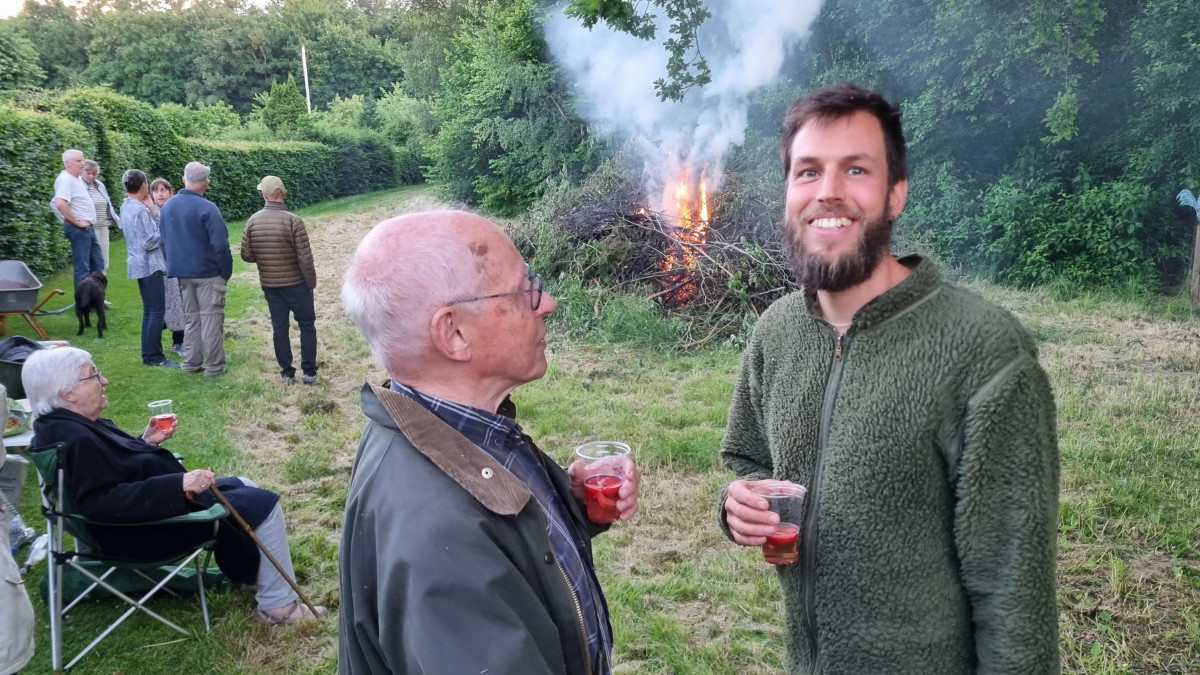 Igen i 2023 var der ikke bål. Alt var ellers tilrettelagt, bålet bygget op så vi let kunne få ild i det – med tørre grene fra forårets fældning af gråpilen ved søen. Men der var lige 1,5 måned uden regn og vi valgte i sidste øjeblik ikke at tænde bål, så der ikke føg gnister rundt i det tørre græs. Vi samledes så ved et myggelys og snakkede sammen i lang tid. Den sidste Skt. Hans med Peter og Berit som beboere her.