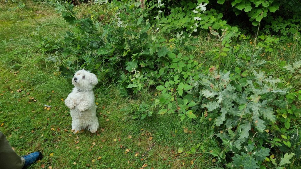 Birgit har oprettet en “hygel” med blomster. Forslag: fjerne krat med hasseltræer i udkanten af arealet. Bevare nogle af træerne fx. taks, hyld og røn. Kort sagt vedligeholde området - Grib spaden og grav brombær op.