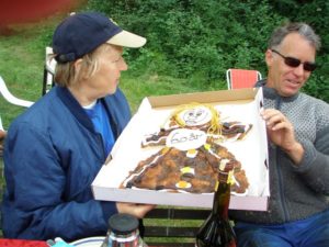 Formand Inger M. Clausen og kasserer Jan Hededahl Svendsen deler jubilæumskage ud ved forårets arbejdsdag i 2008