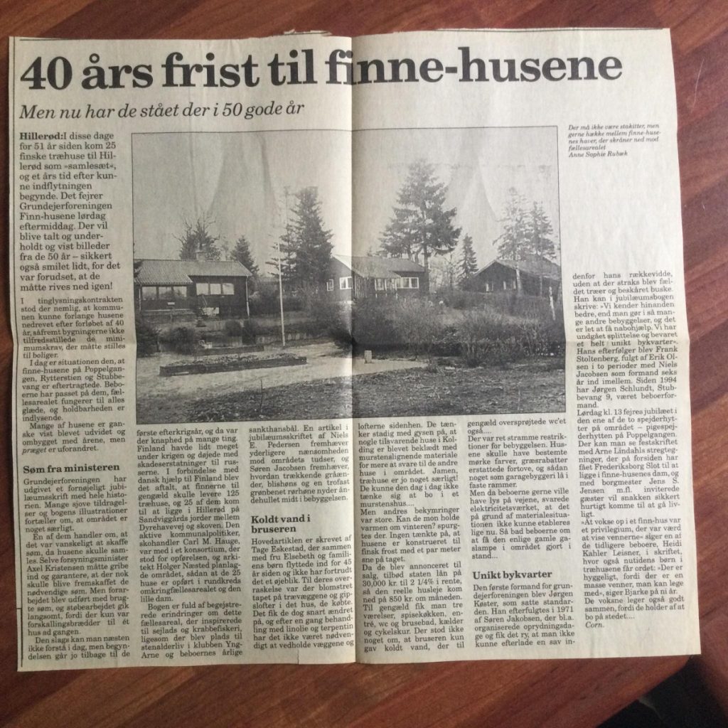 I 1998 blev jubilæumsskriftet “Finn-husene i Hillerød 1948-1998” udgivet. Heri kan læses om baggrunden for at Finnhusene kom til Danmark. Der indgår en liste med beskrivelser af formændene siden 1962. Børn, der har boet i Finnhusene, fortæller om deres opvækst og hvad området har betydet for dem. Her er nogle gamle fotos fra reception og fest: