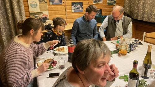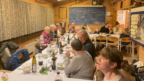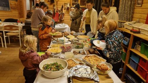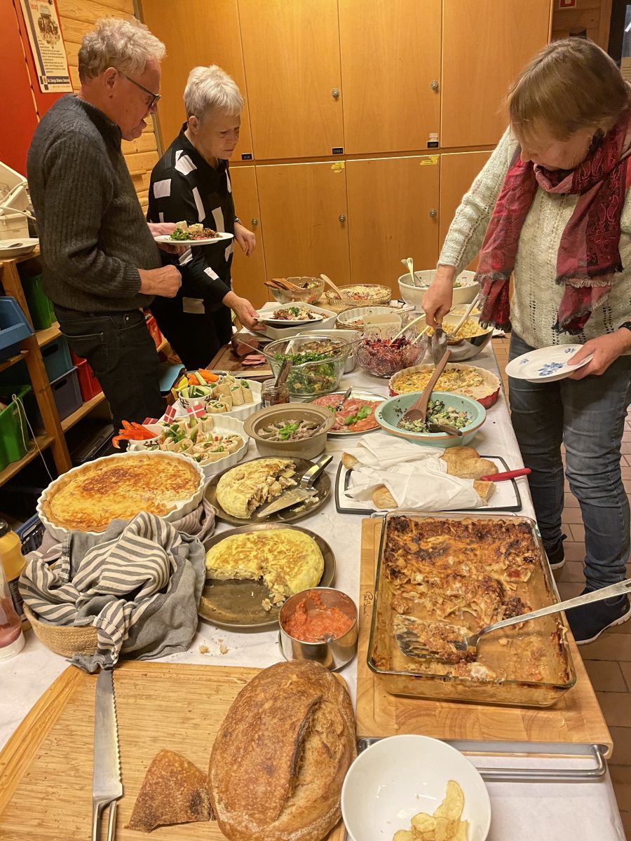 Det var aftensmad efter princippet ”medbringer aftensmad til deling” til et tag-selv-bord. Det hele foregik i og ved C4-hytten.