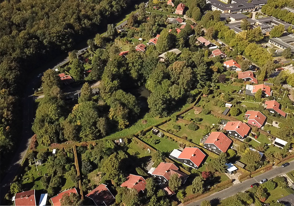 Se området fra luften: Haverne, husene. Følg fuglenes indflyvning til søen, gå på æblerov og se Finnhusefuglene i træerne. Flyv ind på søen og stig op og se Hillerød fra oven.