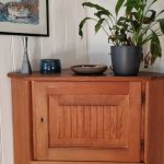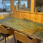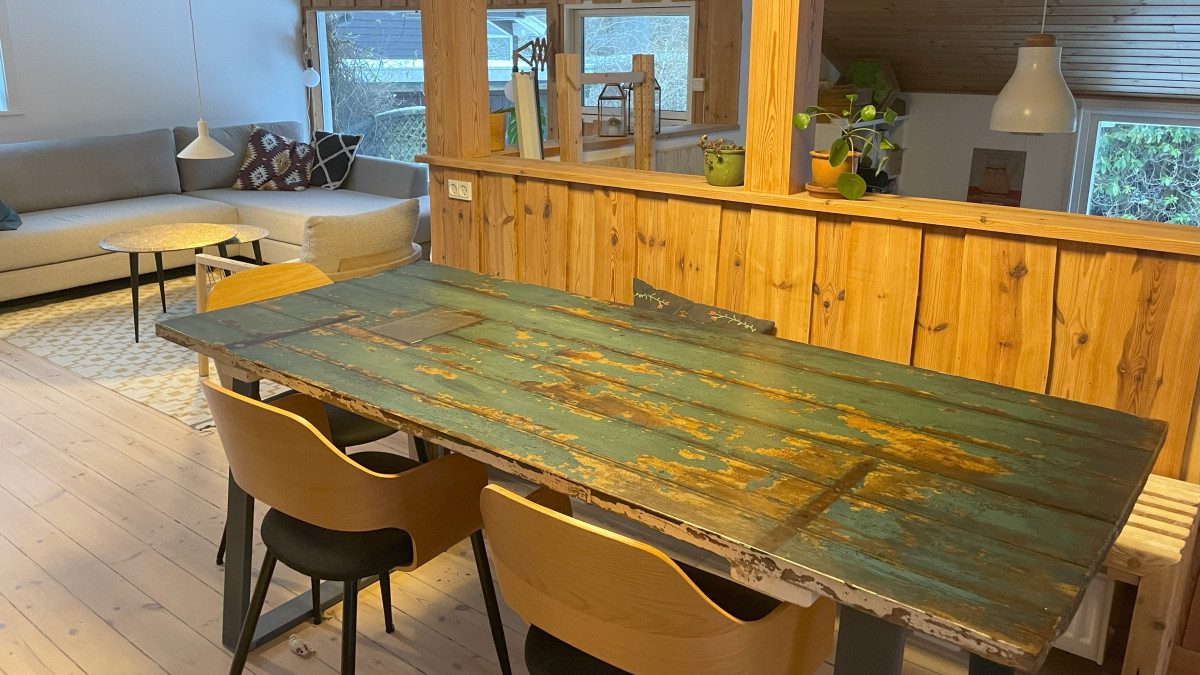 Vi er tilbage i køkkenalrummet og har alle fundet plads ved spisebordet. Et bord, Anna har selv lavet: en gammel dør med transparent epoxy som bordplade. En sjov detalje er en lille mønt, som Anna lod blive i lakken, men der er også en lille myg, som forvildede sig ned i den våde epoxy og dermed er blevet en del af spisebordet. Anna og Brian er begge dygtige med træ og fortæller, at en af deres drømme er at få et værksted, hvor de kan bygge nye møbler af genanvendt træ eller møbler.