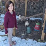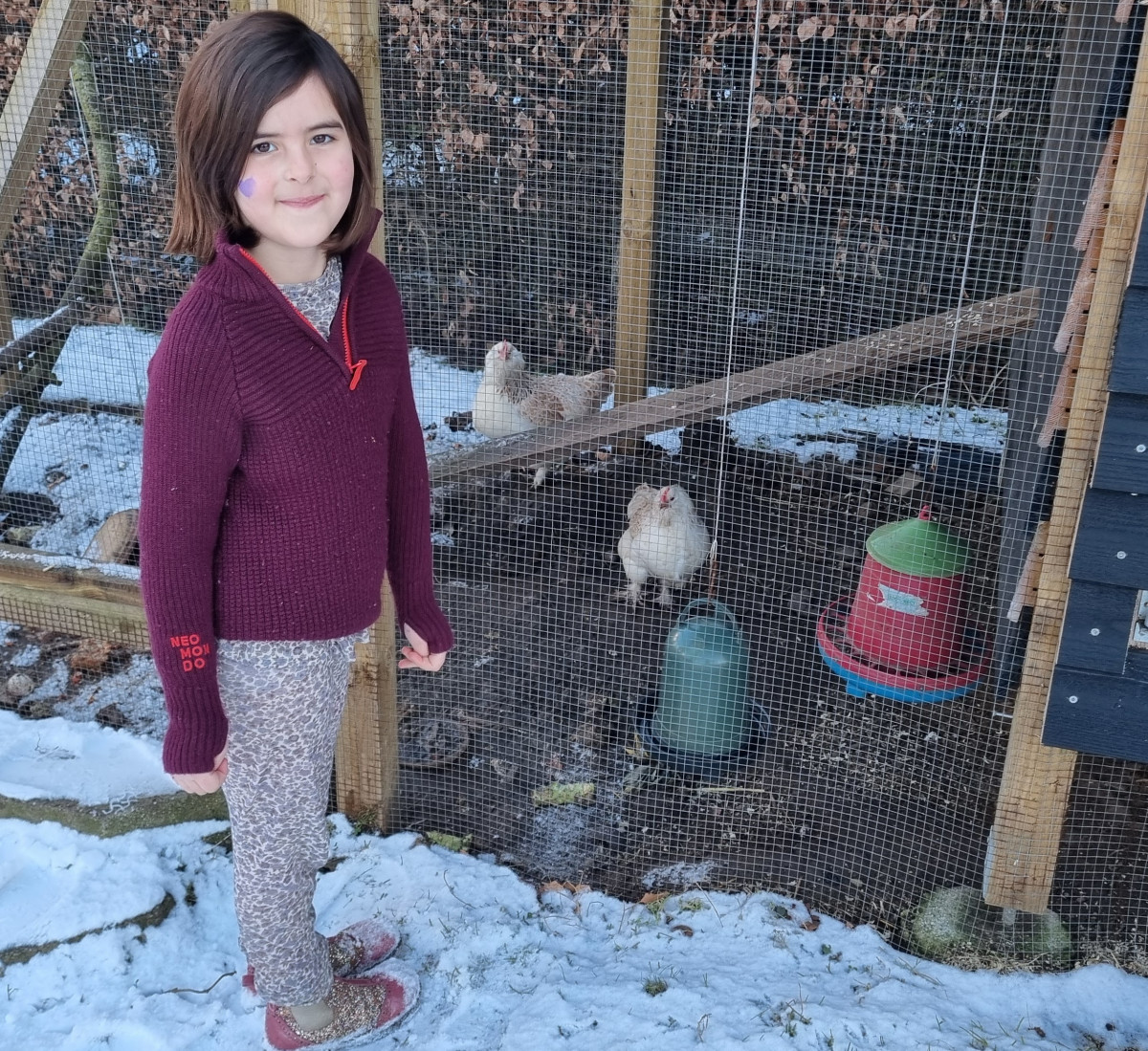 Vi starter med at tage det traditionelle foto foran huset. Sneen er lige faldet i løbet af natten, og haven er stor og fyldt af hvid pulversne. En bænk bliver sat op, men indenda har Ingrid sagt, at hun gerne vil sidde med Katarina, en faverolle-høne, på skødet, så henter hun Katarina og Johannes Halte-Lotte i hønsehuset, og familien bænker sig i det