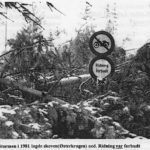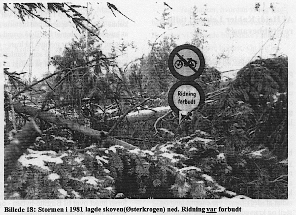 November: Storm lægger store dele af Præstevang Skov ned. Indkørslen overfor Poppelgangen blir fuldstændig lukket. Se kopi af foto fra jubilæumskrift 1998: